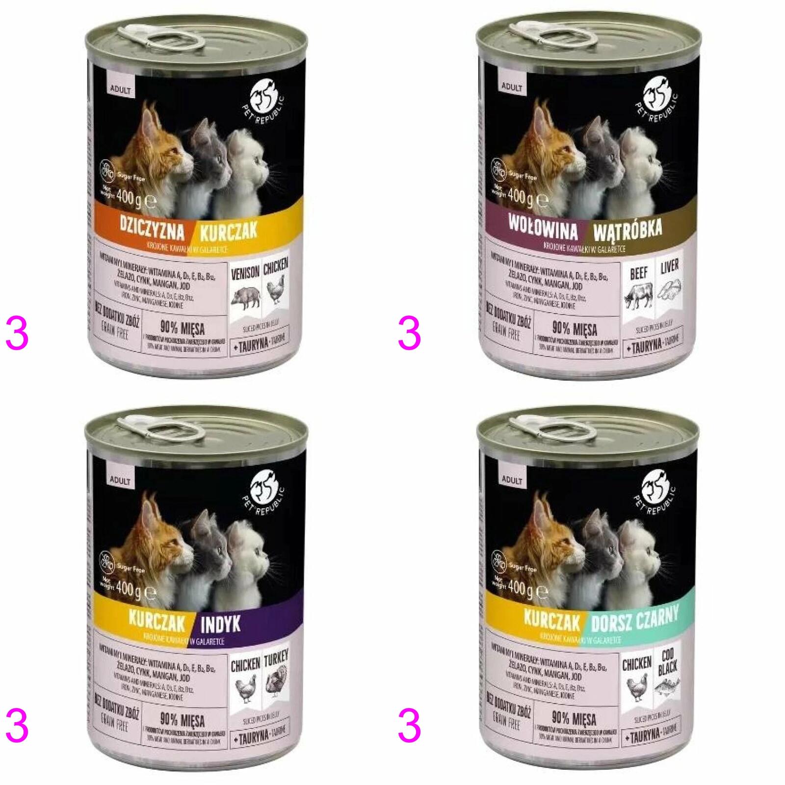 - 3x Pet Republic dla kotów kawałki w galaretce z kurczakiem i dorszem 400g